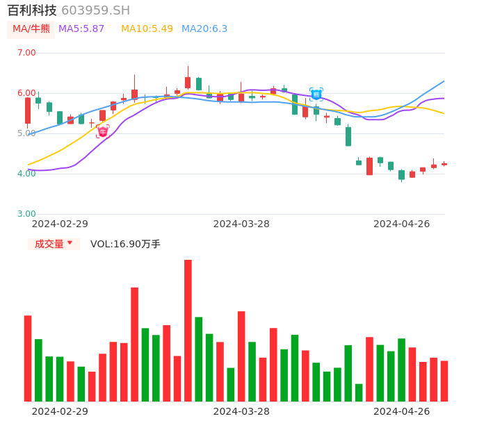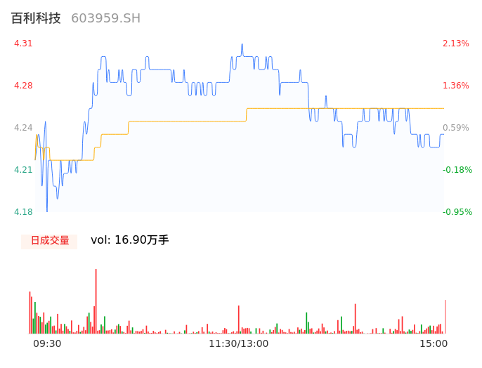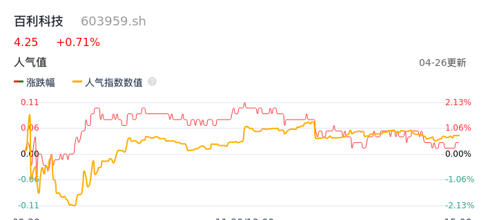 04月26日,百利科技收报4.25,股价涨幅0.71%,成交金额7191.15万元,换手率3.45%。