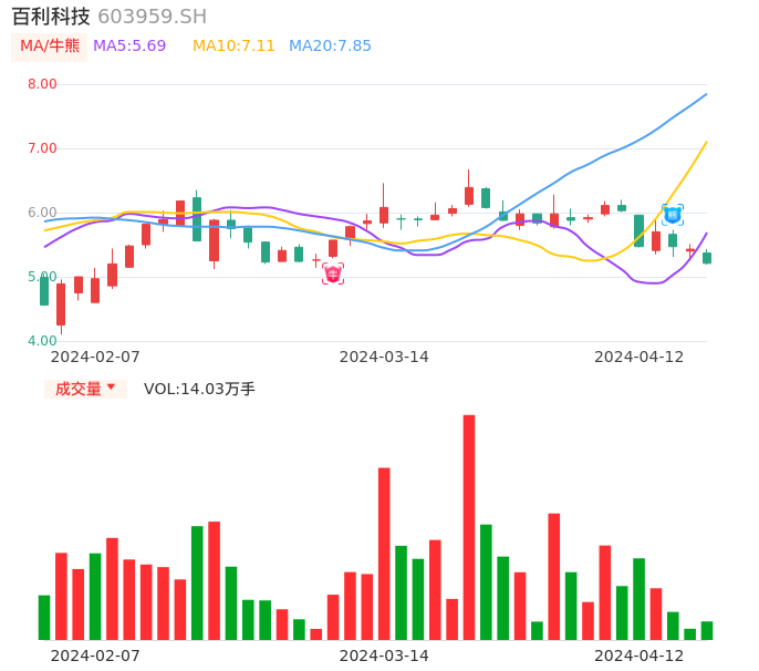 04月12日,百利科技收报5.21,股价涨幅-4.05%,成交金额7379.79万元,换手率2.86%。