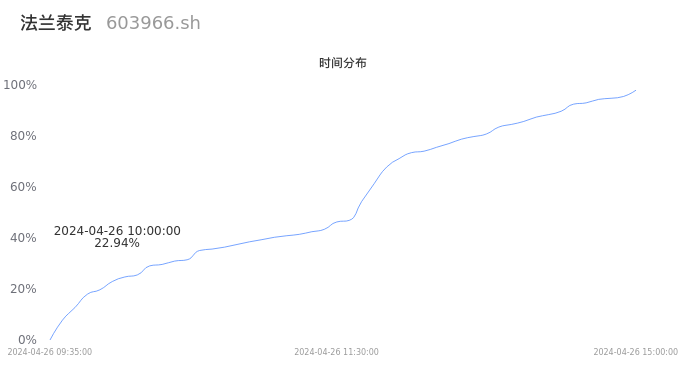 根据成交分布分析,该股票当天放量成交,成交清淡。时间上看,早盘前半小时成交量占据当天总成交量的22.94%;价格上看,成交呈现中间峰。成交分布分析主要研究股票成交的分布特性,不具有预测功能,请知悉。