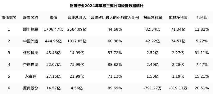 中创物流最新报告期数据为年报,下表汇总了物流行业内市值靠前的公司年报主要经营数据
