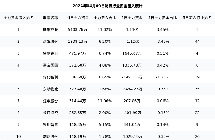 中创物流今日净流出3259.06万元,主力占比10.17%,在行业内排名:45/45;5日净流入4169.85万元,主力占比1.30%,在行业内排名:3/45。
