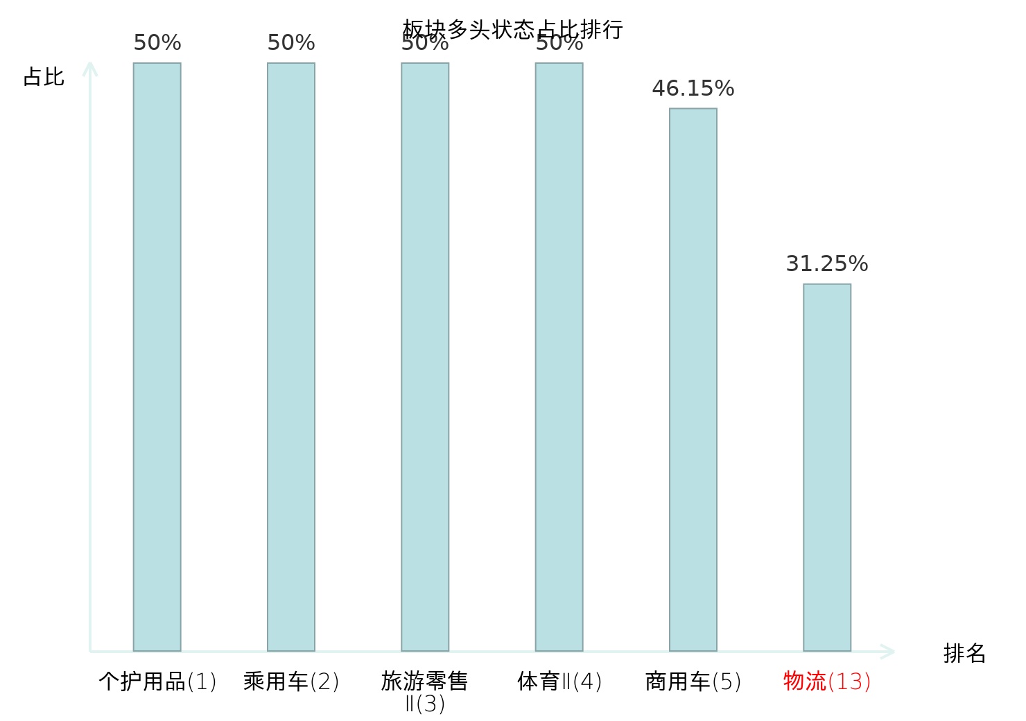 全市场所有行业板块中主力多头状态占比排名中,个护用品板块位居第一。林业Ⅱ板块名次提升最快,较昨日上升94位。