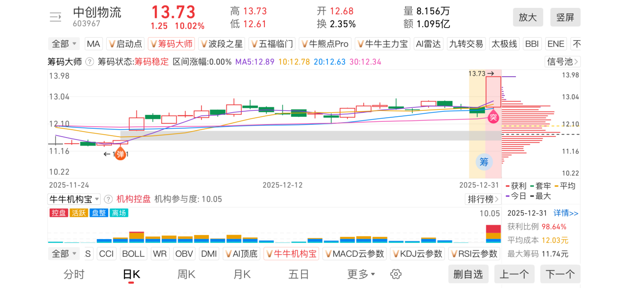 2)20251231-中创物流-603967-【筹码大师】和【牛牛机构宝】-近期出现弹信号且底部量柱由绿转红
