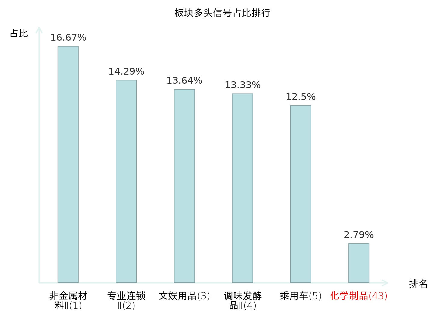 全市场所有行业板块中主力多头信号占比排名中,非金属材料Ⅱ板块位居第一。乘用车板块名次提升最快,较昨日上升115位。