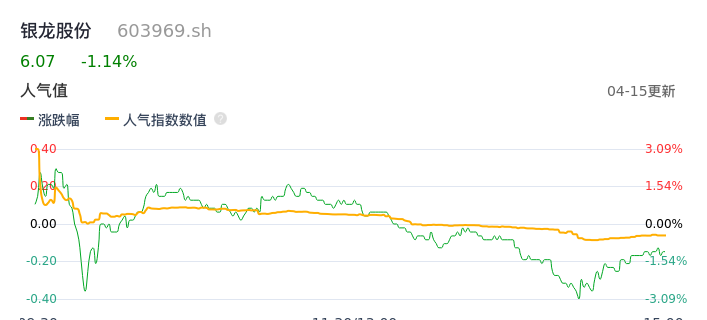 04月15日,银龙股份收报6.07,股价涨幅-1.14%,成交金额1.53亿元,换手率2.98%。