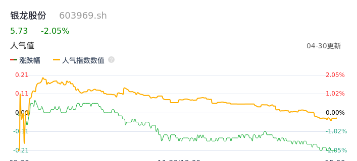 04月30日,银龙股份收报5.73,股价涨幅-2.05%,成交金额7105.38万元,换手率1.45%。