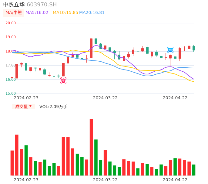 04月22日,中农立华收报18.07,股价涨幅-1.69%,成交金额3804.56万元,换手率0.78%。