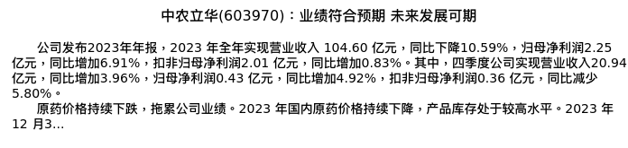 值得注意的是:2024年04月东北证券的王春雨/孙鹏程分析师,首次发布关于中农立华的研究报告,标题为:中农立华(603970):业绩符合预期 未来发展可期。