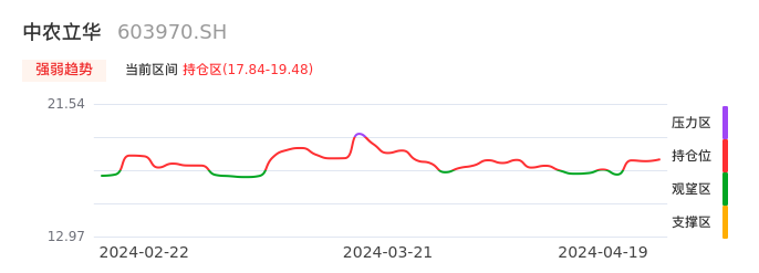 我们来看一下该股的九方特色指标强弱趋势的情况:中农立华近日从观望区上穿到持仓区。股价短期站稳多头区域,上升动能仍较为充足,可积极关注。后续重点关注上方压力位:19.48元是否能突破上攻。