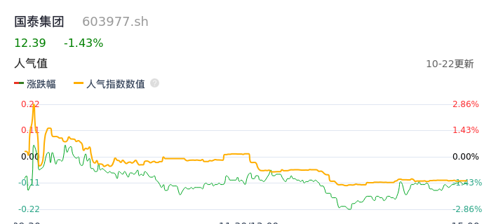 10月22日,国泰集团收报12.39,股价涨幅-1.43%,成交金额1.19亿,换手率1.54%。