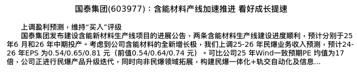 值得注意的是:2024年10月华泰证券的李聪/朱雨时/田莫充分析师,首次发布关于国泰集团的研究报告,标题为:国泰集团(603977):含能材料产线加速推进 看好成长提速。