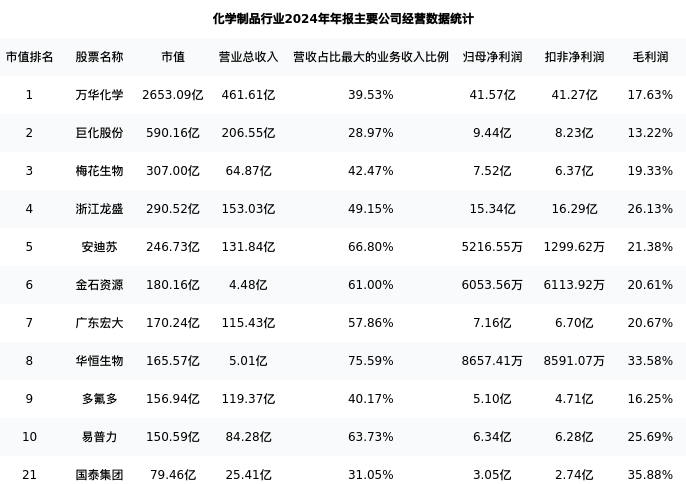 国泰集团最新报告期数据为年报,下表汇总了化学制品行业内市值靠前的公司年报主要经营数据