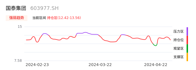 我们来看一下该股的九方特色指标强弱趋势的情况:国泰集团自04月17日从观望区上穿到持仓区。股价近期在多头区域回调整理。后续重点关注多空分界点的争夺:12.42元。如未能有效站稳则可能重新回到空头行情。