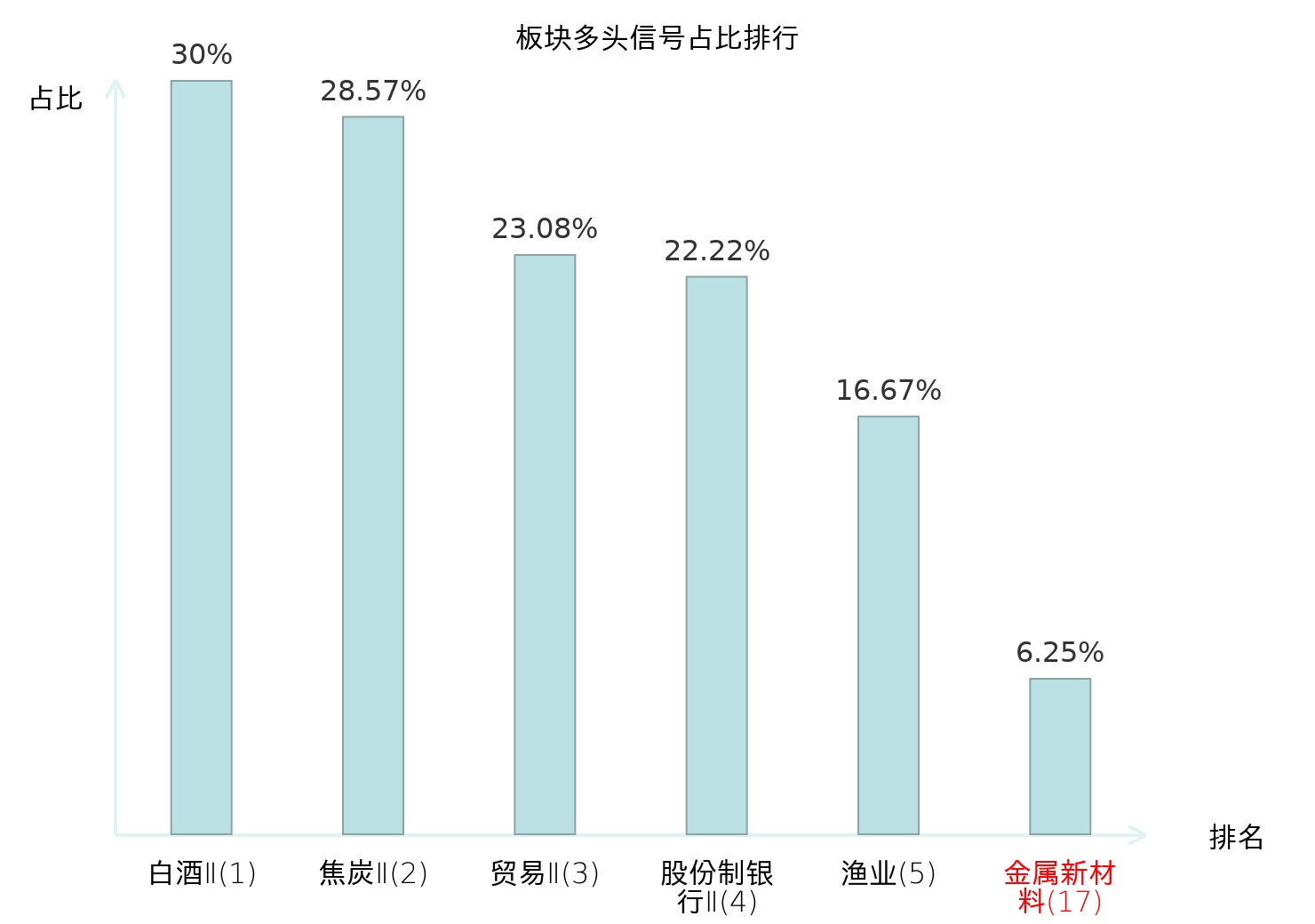 全市场所有行业板块中主力多头信号占比排名中,白酒Ⅱ板块位居第一。焦炭Ⅱ板块名次提升最快,较昨日上升119位。