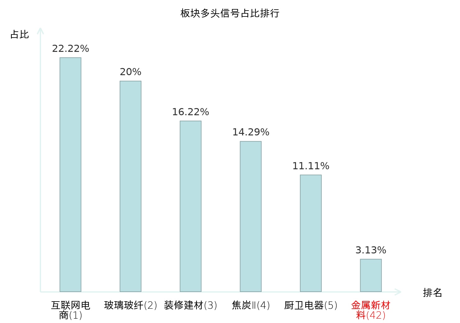 全市场所有行业板块中主力多头信号占比排名中,互联网电商板块位居第一。焦炭Ⅱ板块名次提升最快,较昨日上升118位。