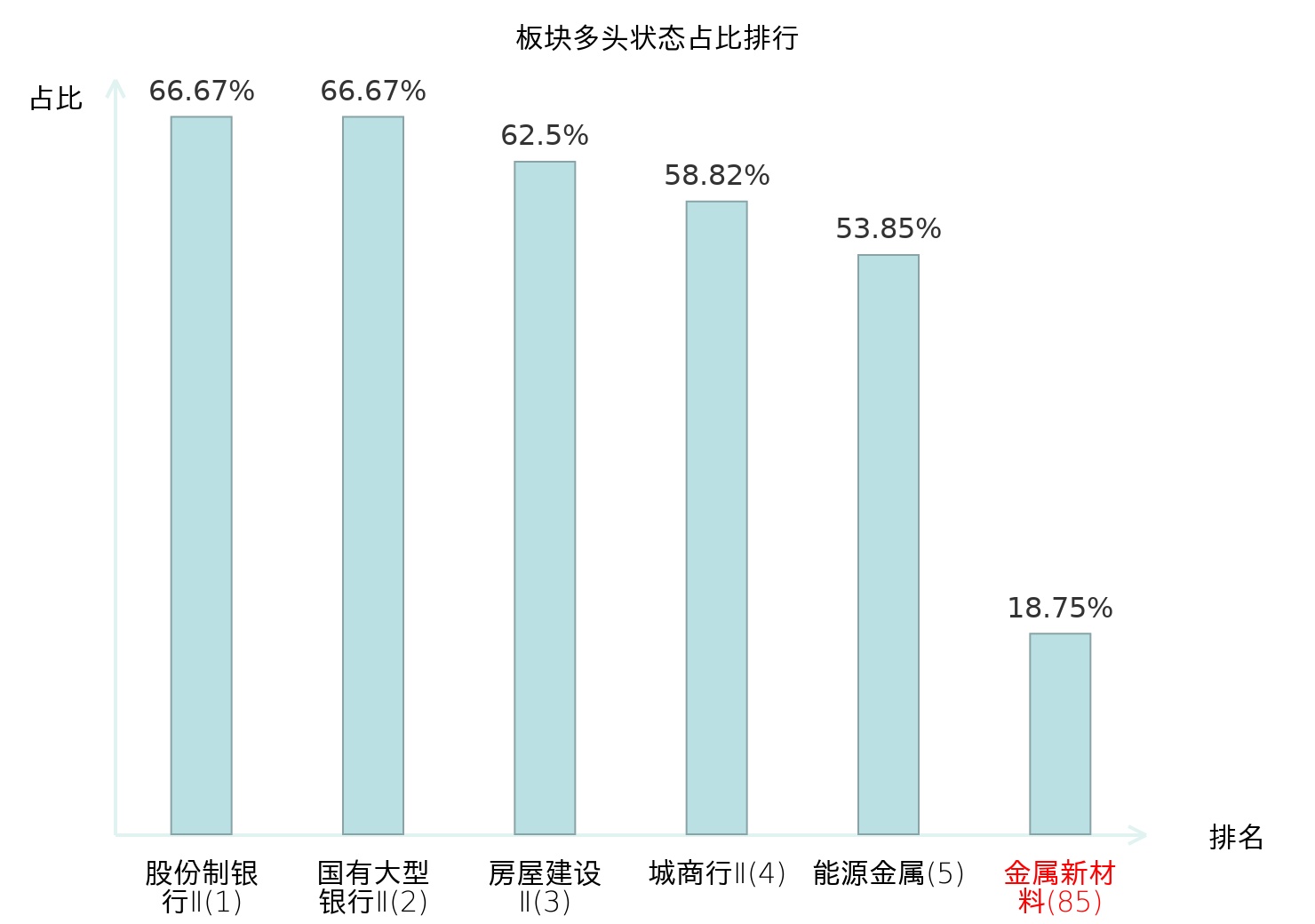 全市场所有行业板块中主力多头状态占比排名中,股份制银行Ⅱ板块位居第一。航空机场板块名次提升最快,较昨日上升68位。