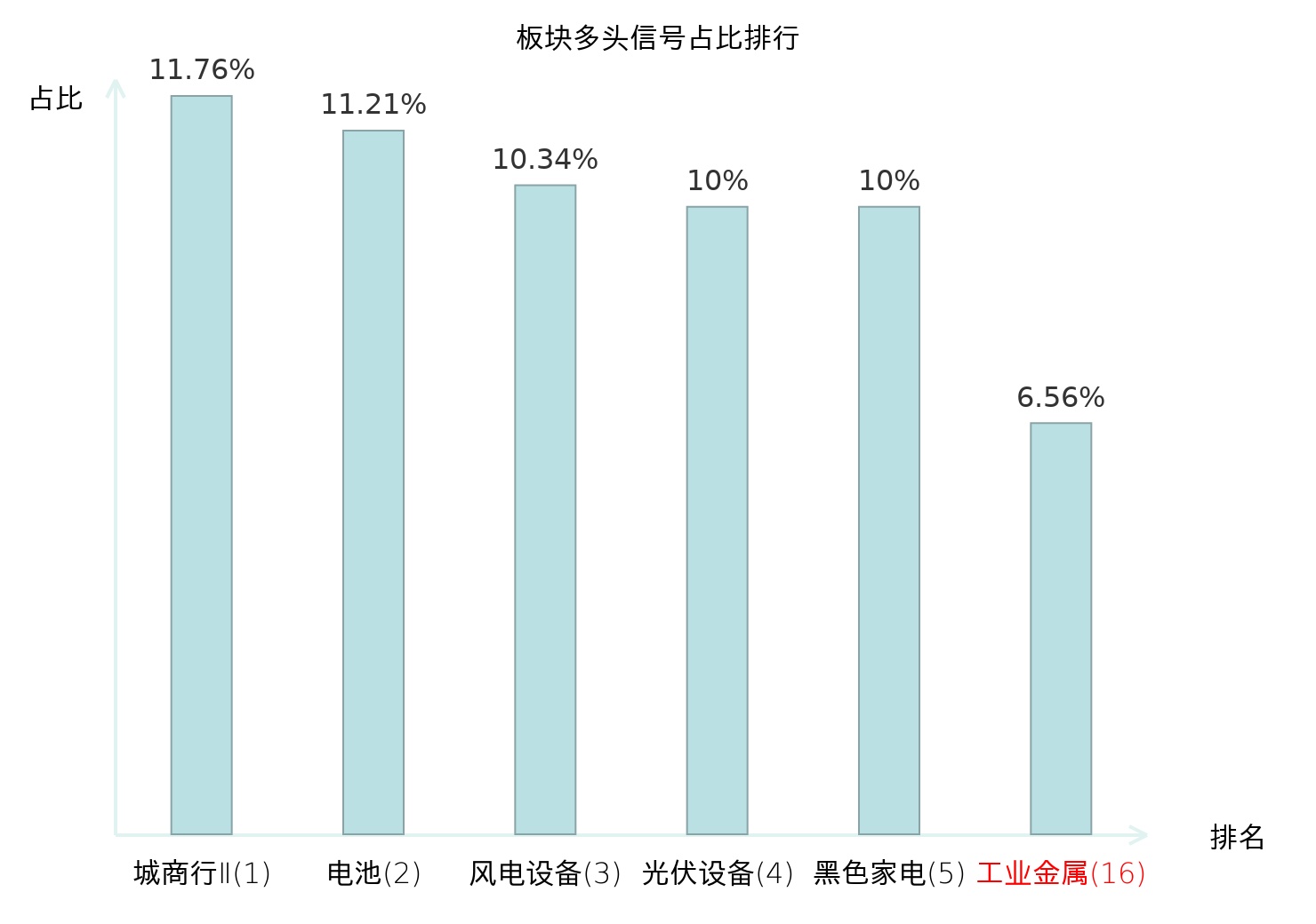 全市场所有行业板块中主力多头信号占比排名中,城商行Ⅱ板块位居第一。黑色家电板块名次提升最快,较昨日上升107位。