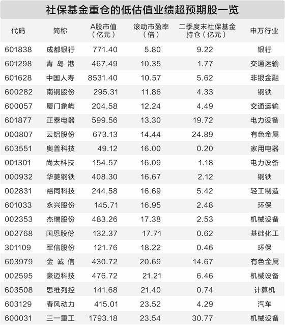 从机构持仓角度来看,据数据宝统计,业绩超预期的个股中,二季度末获得社保基金持仓的有41股,其中7股获持仓市值超10亿元,分别是三一重工、云铝股份、正泰电器、金诚信、鹏鼎控股、西部超导、赤峰黄金。