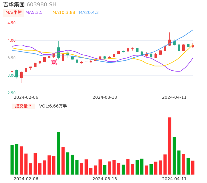 04月11日,吉华集团收报3.86,股价涨幅1.05%,成交金额2576.29万元,换手率0.95%。