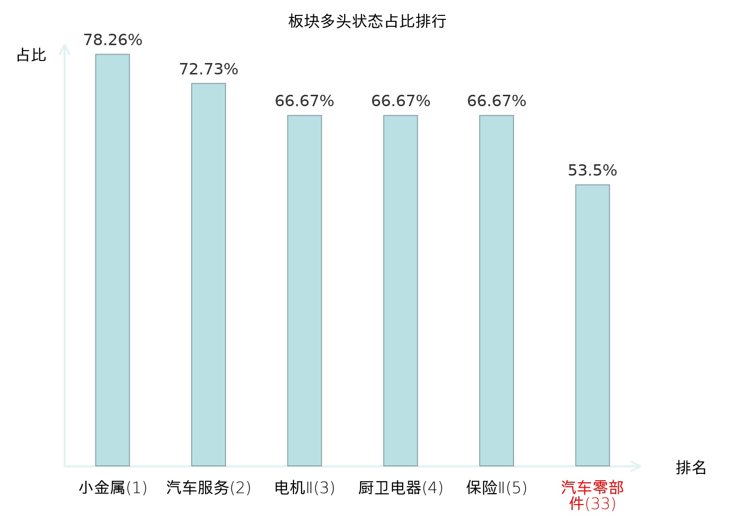 全市场所有行业板块中主力多头状态占比排名中,小金属板块位居第一。农业综合Ⅱ板块名次提升最快,较昨日上升88位。