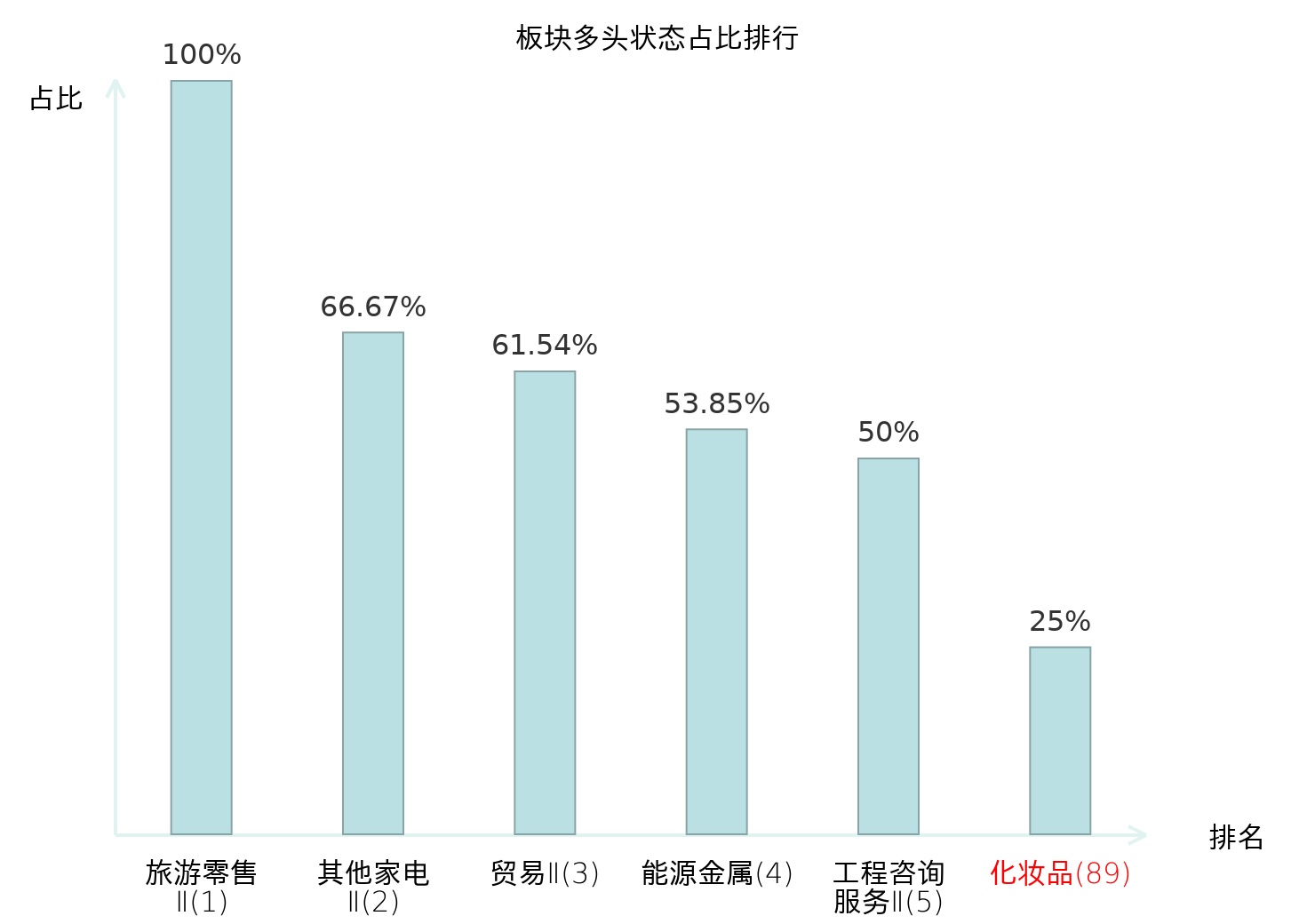 全市场所有行业板块中主力多头状态占比排名中,旅游零售Ⅱ板块位居第一。冶钢原料板块名次提升最快,较昨日上升37位。