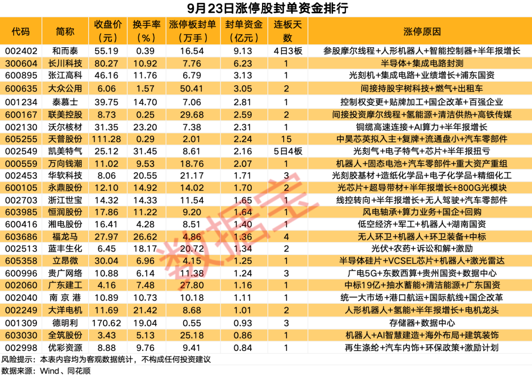 以封单金额计算,22股封单资金均超1亿元,和而泰、长川科技、张江高科封单资金居前,分别为9.13亿元、6.23亿元、3.13亿元。