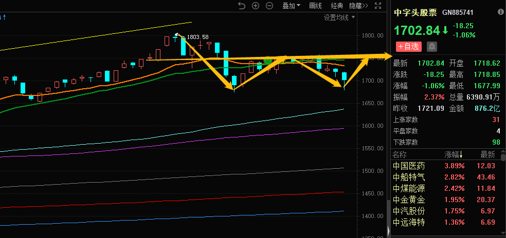 而今天国家队护盘是有出力的,中字头这边发力比较明显的是银行板块,没有银行就没有今天深V的可能,尾盘证券的跌幅也缩小了不少。整个中字头板块短期这里有形成双底(W底)的结构迹象,因此对指数来说也不会太悲观。