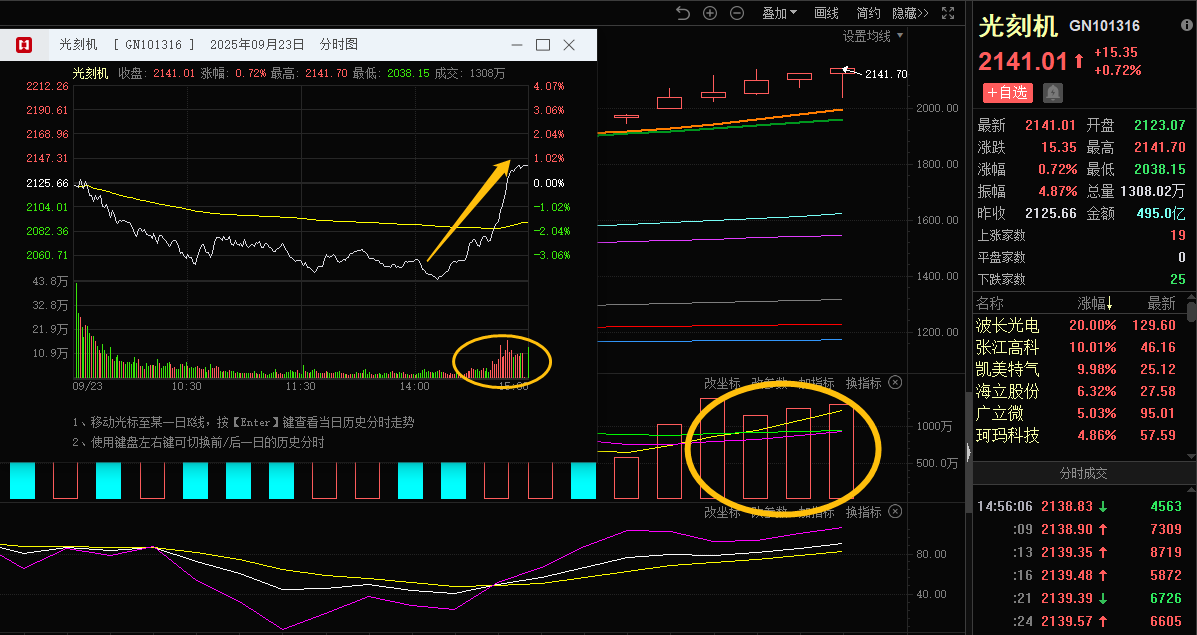 相信大家看消息也看到了,尾盘光刻机出现明显的资金抢先手,经过早盘的一波砸盘,筹码的割肉,在尾盘凯美特气发力,张家高科、波长光电跟风发力,凯美特气5天4板,波长光电、张江高科首板。这个方向特别的利好,除了近期花旗发消息说:国庆假期之前,中国半导体行业可能会报告更多积极的进展。中国推动发展自给自足的人工智能芯片生态系统也是中国代工厂的积极催化剂。叠加之前反复强调的国产光刻机三季度量产,近期堆量的情形看,这个位置光刻机很有可能会成为节前和节后资金进攻的重点。波长光电沿着5日线堆量,这个位置有调整的可以多留意低吸机会。趋势还是很好看的。这种只要不走连板加速,就不容易结束行情。另外和光刻机一起的光刻胶方向晶瑞电材也是趋势不错的向上格局比较健康,跌时考虑买。而西陇科学、国风新材也都是前段炒光刻胶的有辨识度的一些个股。