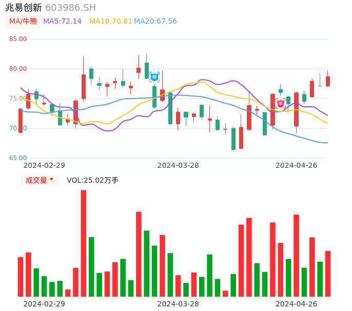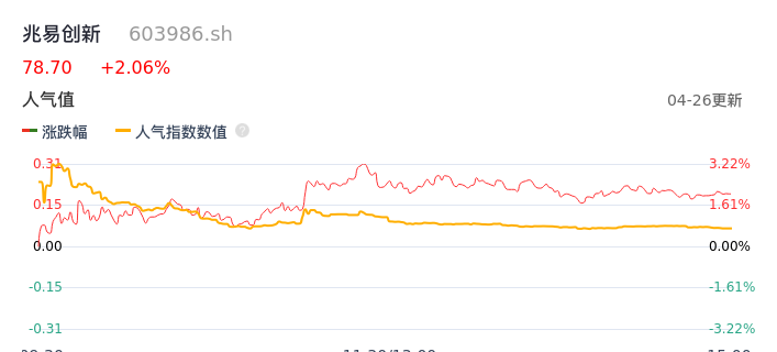 04月26日,兆易创新收报78.70,股价涨幅2.06%,成交金额19.65亿元,换手率3.77%。