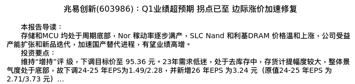 值得注意的是:2024年04月国泰君安的舒迪/陈豪杰分析师,首次发布关于兆易创新的研究报告,标题为:兆易创新(603986):Q1业绩超预期 拐点已至 边际涨价加速修复。