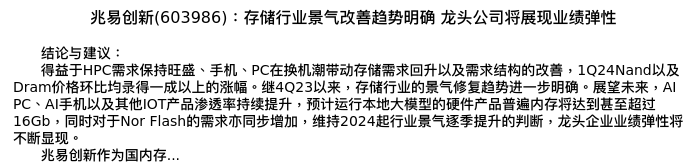 值得注意的是:2024年03月群益证券(香港)的朱吉翔分析师,首次发布关于兆易创新的研究报告,标题为:兆易创新(603986):存储行业景气改善趋势明确 龙头公司将展现业绩弹性。