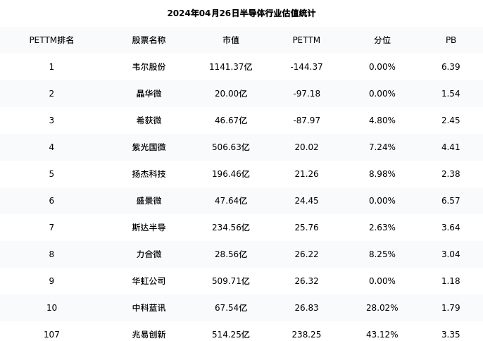 从估值角度看:兆易创新最新市盈率PETTM为238.25,在行业内排名104/153,处于43.12分位。