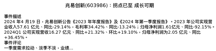 值得注意的是:2024年04月长江证券的杨洋/张梦杰/范超分析师,首次发布关于兆易创新的研究报告,标题为:兆易创新(603986):拐点已至 成长可期。