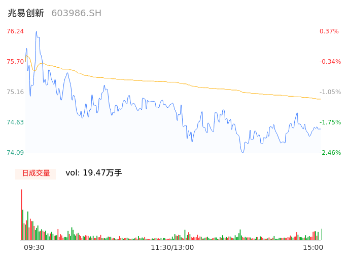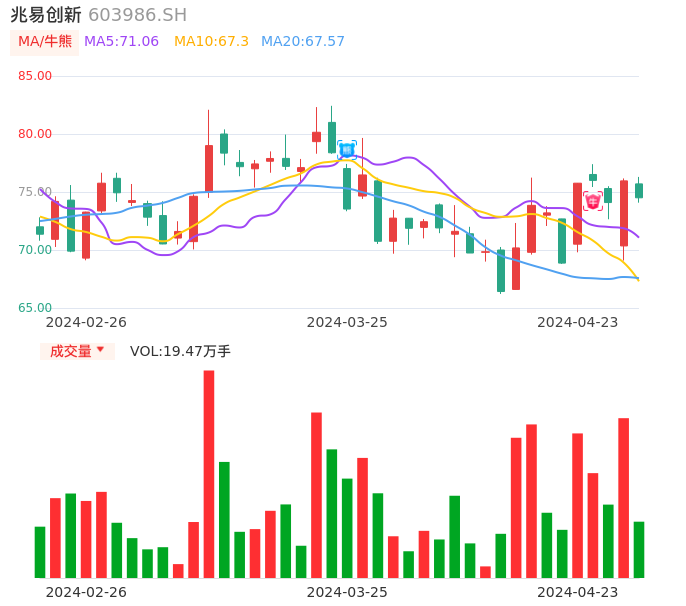 04月23日,兆易创新收报74.50,股价涨幅-1.92%,成交金额14.61亿元,换手率2.93%。