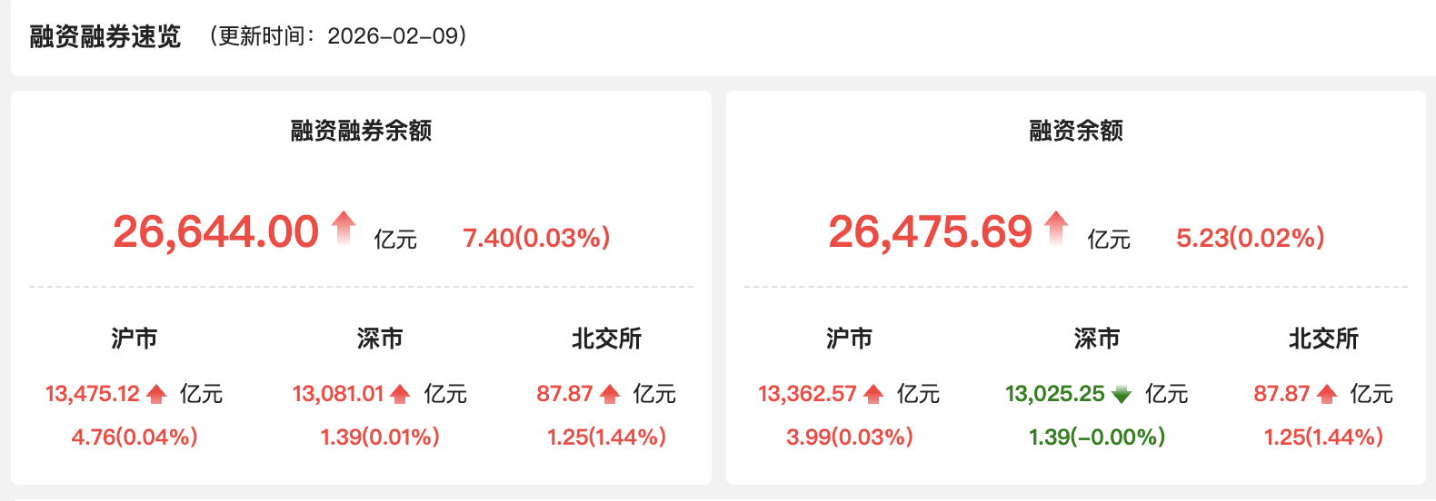 上证报中国证券网讯 2月9日,A股两融余额为26644.00亿元,较上一交易日增加7.40亿元,占A股流通市值比例为2.56%。当日两融交易额为2166.77亿元,较上一交易日增加255.11亿元,占A股成交额的9.53%。
