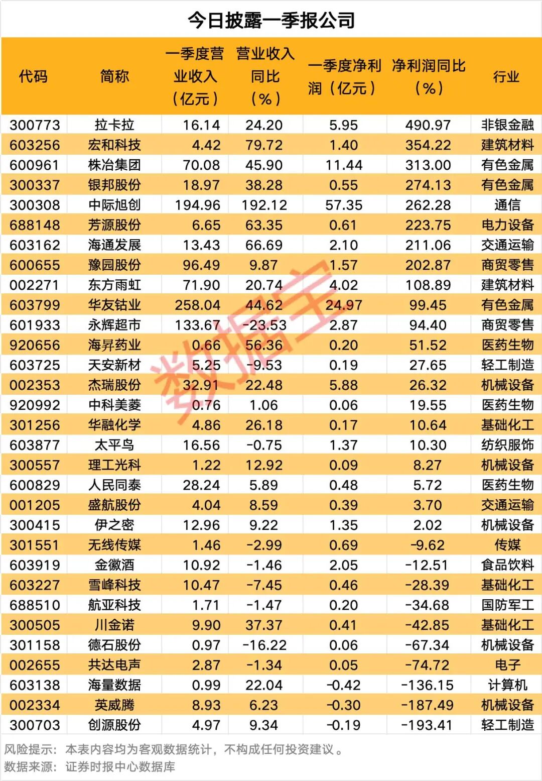 一季报密集披露,今日有31家公司发布一季报,拉卡拉、宏和科技、株冶集团等9家公司一季度净利润同比增幅超100%,净利润增幅居首的是拉卡拉,一季度净利润为5.95亿元,同比增长490.97%。