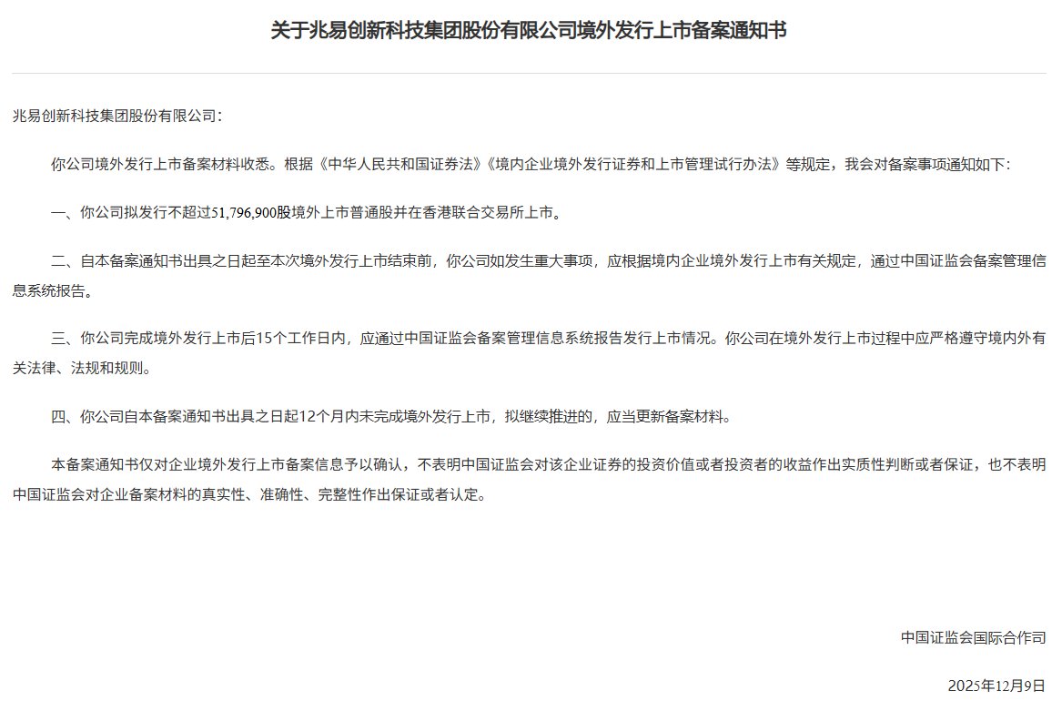 智通财经APP获悉,12月9日,中国证监会国际合作司发布《关于兆易创新科技集团股份有限公司境外发行上市备案通知书》。兆易创新(603986.SH)拟发行不超过51,796,900股境外上市普通股并在香港联合交易所上市。