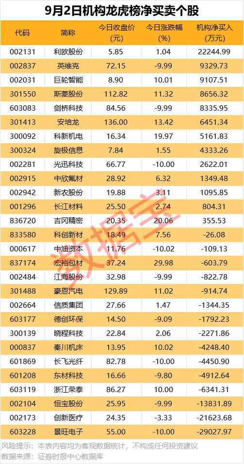 今日龙虎榜中,净买入的个股13只,净卖出的个股15只。5股净买入金额均超8000万元,利欧股份获机构净买入2.22亿元,居首;其次是英维克、巨轮智能、斯菱股份、剑桥科技,分别获净买入9329.73万元、9107.51万元、8656.32万元、8335.95万元。