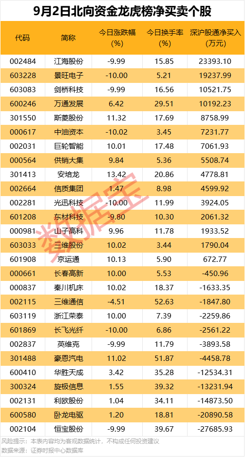净买入居首的是江海股份,金额为2.34亿元;其次是景旺电子、剑桥科技、万通发展、斯菱股份,分别获净买入1.92亿元、1.05亿元、1.02亿元、8758.99万元。