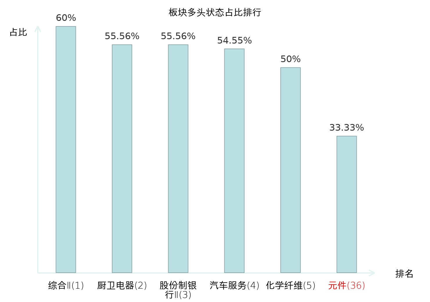全市场所有行业板块中主力多头状态占比排名中,综合Ⅱ板块位居第一。出版板块名次提升最快,较昨日上升55位。