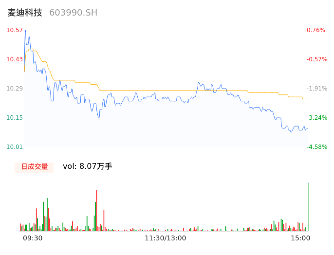 04月12日,麦迪科技收报10.01,股价涨幅-4.58%,成交金额8259.96万元,换手率2.90%。