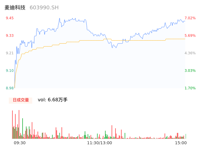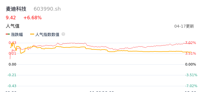 04月17日,麦迪科技收报9.42,股价涨幅6.68%,成交金额6220.13万元,换手率2.40%。