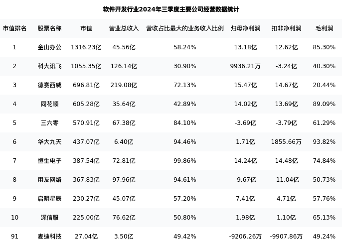 麦迪科技最新报告期数据为三季度,下表汇总了软件开发行业内市值靠前的公司三季度主要经营数据
