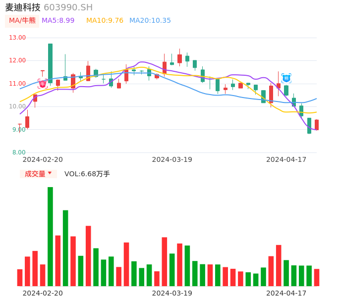 04月17日,麦迪科技收报9.42,股价涨幅6.68%,成交金额6220.13万元,换手率2.40%。