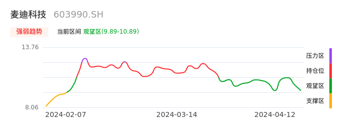 04月12日,麦迪科技收报10.01,股价涨幅-4.58%,成交金额8259.96万元,换手率2.90%。