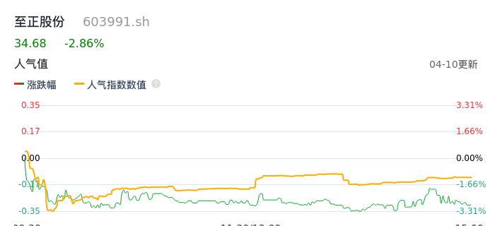 04月10日,至正股份收报34.68,股价涨幅-2.86%,成交金额3374.62万元,换手率1.30%。