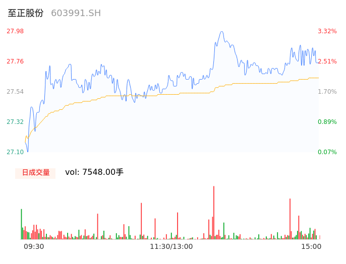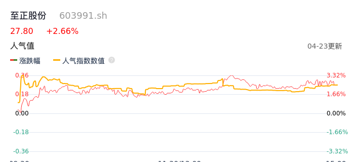 04月23日,至正股份收报27.80,股价涨幅2.66%,成交金额2086.52万元,换手率1.01%。
