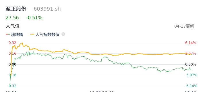 04月17日,至正股份收报27.56,股价涨幅-0.51%,成交金额5578.47万元,换手率2.69%。