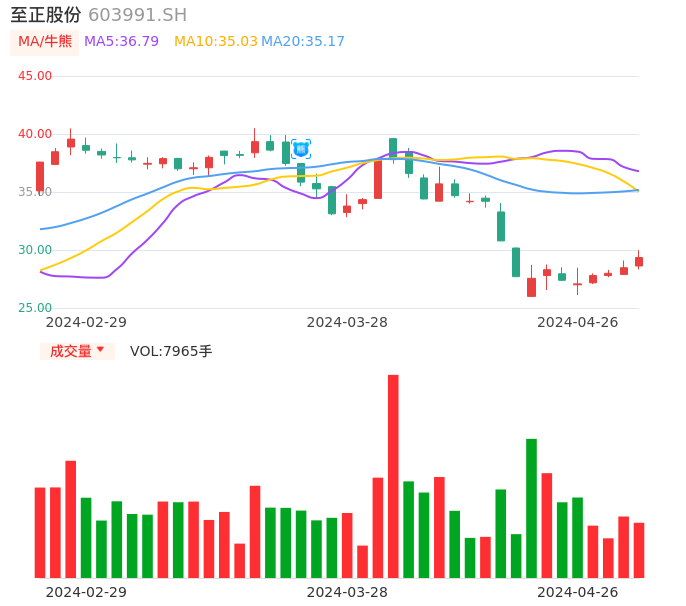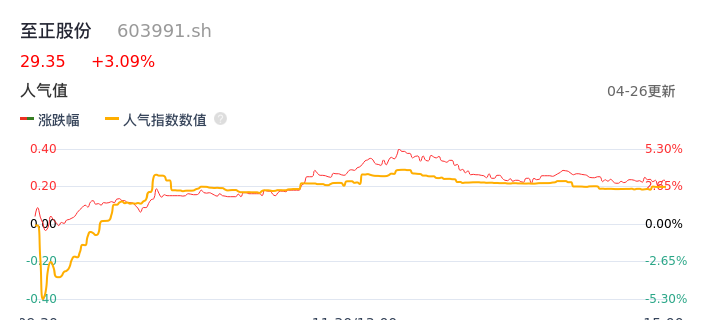 04月26日,至正股份收报29.35,股价涨幅3.09%,成交金额2325.99万元,换手率1.07%。