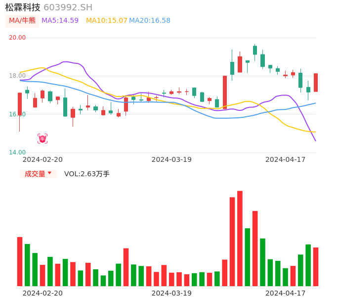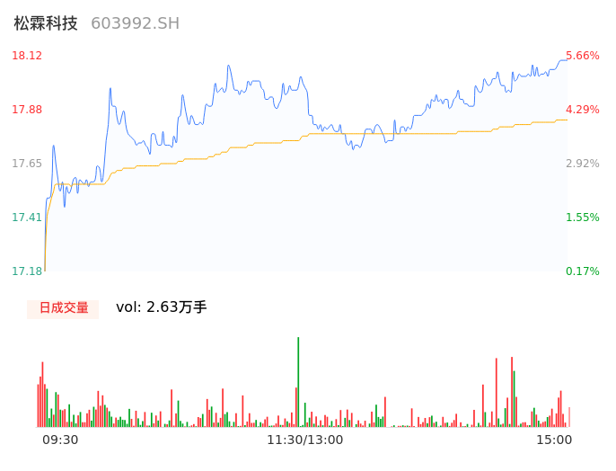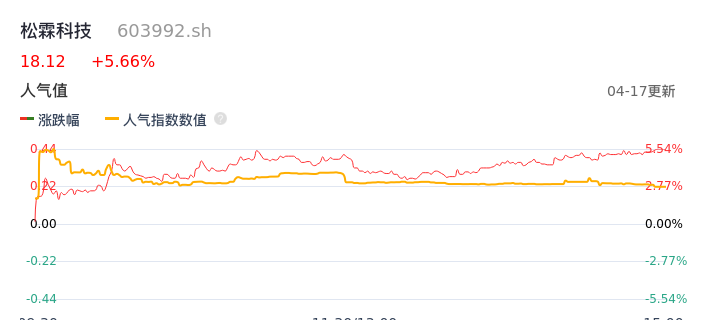 04月17日,松霖科技收报18.12,股价涨幅5.66%,成交金额4693.03万元,换手率0.66%。